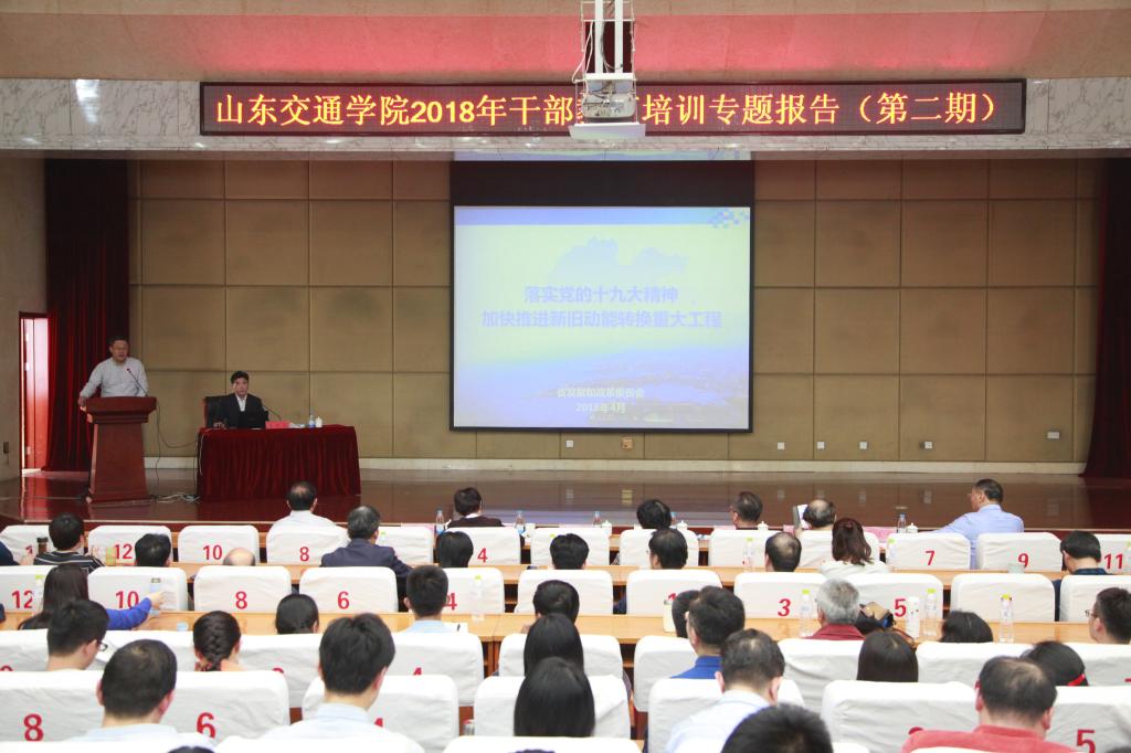 为学习宣传贯彻党的十九大精神,深入学习贯彻习近平新时代中国特色社会主义思想,推动落实新旧动能转换工程,4月20日下午,我校邀请省发改委政策法规处处长宋文华作专题辅导报告。学校领导孙秀丽、陈松岩、唐勇、徐晓红、孙云早、孔祥云、范玉斌、姜华平出席会议。报告会由院长陈松岩主持。