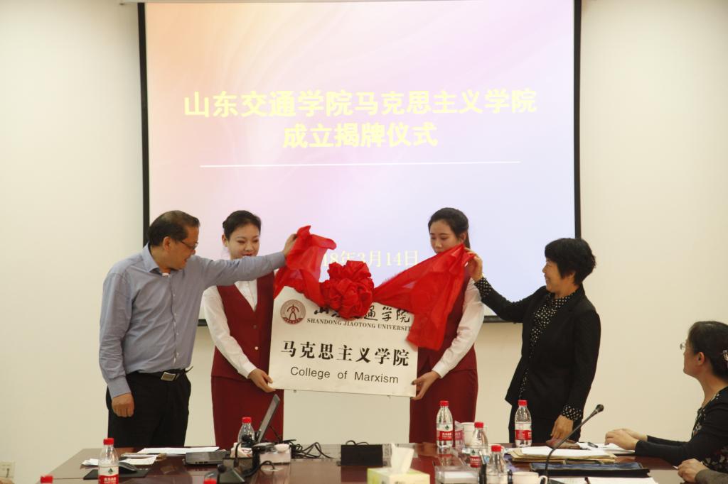 宋光军宣读了学校党委关于马克思主义学院机构设置和人事任命等相关文件。刘欣堂、孙秀丽共同为山东交通学院马克思主义学院揭牌,整个会场气氛庄重而热烈。