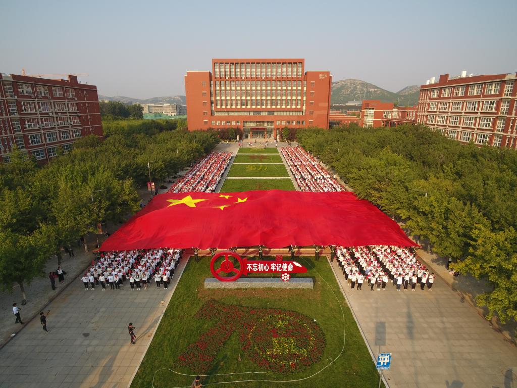 活动最后,全体人员齐唱《我和我的祖国》。在校国旗护卫队的带领下,长清校区2019级全体新生将一面巨型国旗双手托起,由学校图书馆一路向东,缓缓传递至“不忘初心 、牢记使命”主题雕塑,以此表达全校师生对祖国的爱国之情、报国之志。