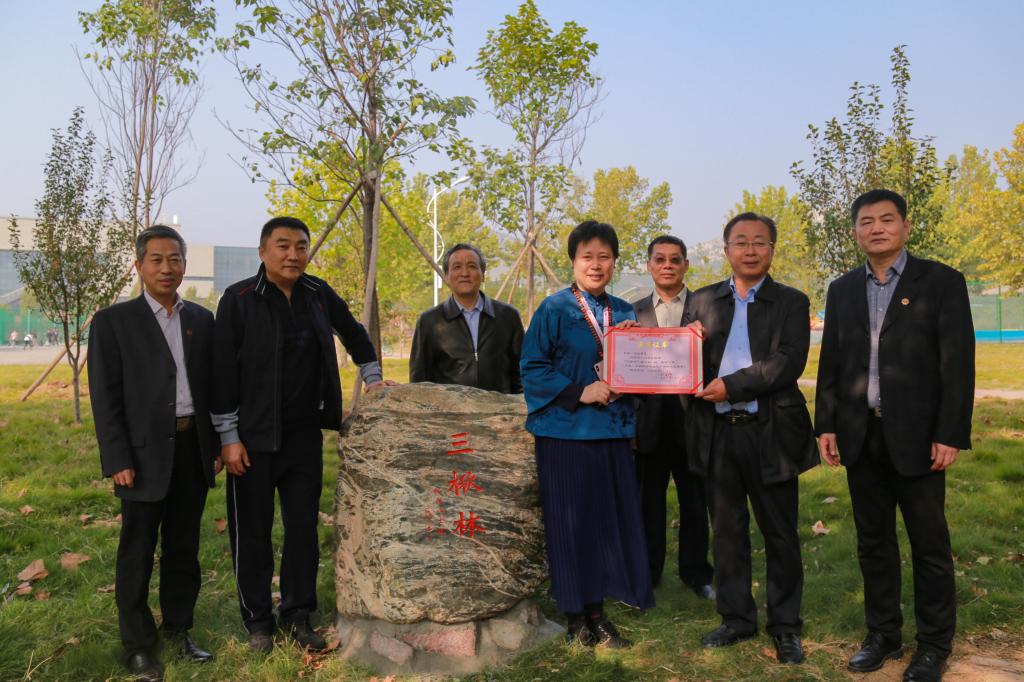 座谈会结束后,大家一起栽植了象征“春华秋实”的楸树,并在泰山石刻“三楸林”前合影留念,唐勇为校友们颁发了捐赠证书。