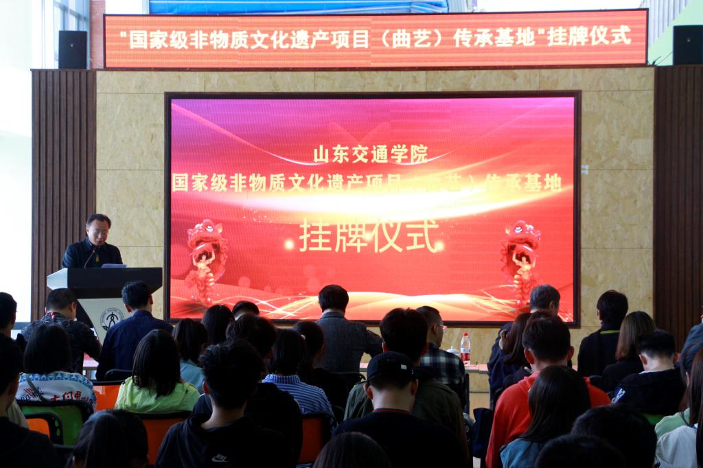 为响应国家非物质文化遗产保护工作,传承优秀非物质文化遗产,10月23日下午,学校在长清校区工程中心大学生创新创业教育实践基地路演大厅举行了“国家级非物质文化遗产项目(曲艺)传承基地”挂牌仪式。山东省艺术研究院院长张积强、山东省非物质文化遗产研究所所长郭学东、学校党委副书记唐勇出席活动。山东省非物质文化遗产传承人和学生代表共计200余人参加活动。活动由团委书记周颜玲主持。
