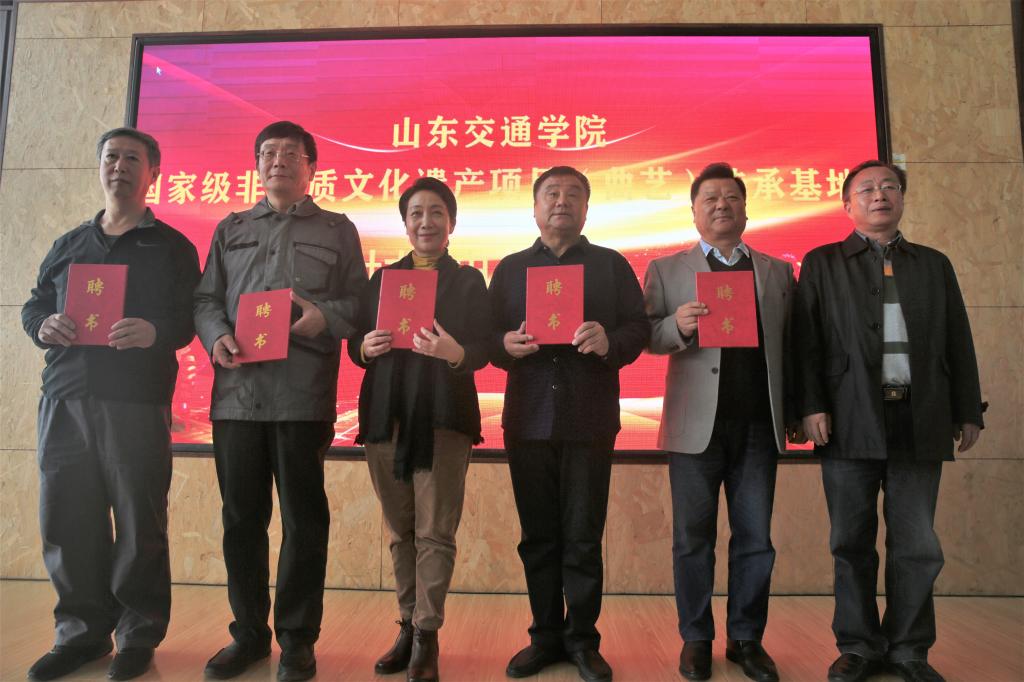唐勇、张积强共同为传承基地挂牌。唐勇为山东省非物质文化遗产研究所所长、我省曲艺学重点学科学术带头人郭学东、山东省曲艺家协会副主席李连伟、山东省快书非物质文化遗产传承人阴军、山东琴书非物质文化遗产传承人杨珀、魏务良颁发了学校曲艺传承基地艺术顾问聘书。
