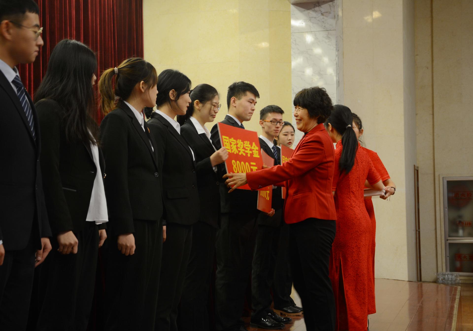 孙秀丽为国家奖学金获得者颁奖,陈松岩为校长奖学金获得者颁奖,与会嘉宾为其他奖助学金获得者代表颁奖。