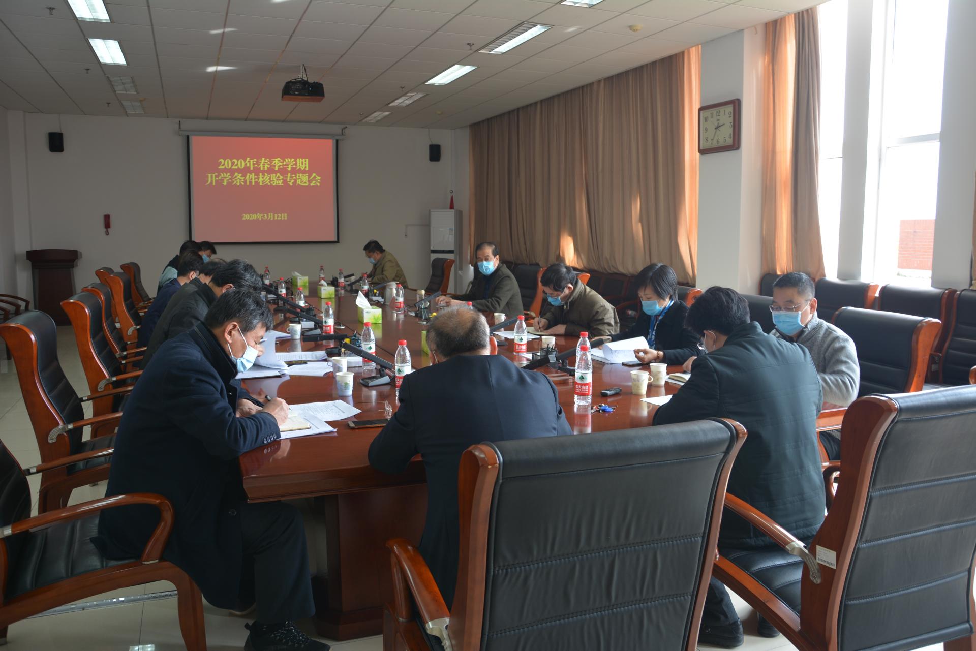 会议围绕山东省教育厅、山东省卫生健康委员会、山东省市场监督管理局印发的《山东省高等学校2020年春季学期开学条件核验细则》,对照组织体系和工作机制、方案制定、制度建立、全员培训、应急处置、全面排查、物资保障、清洁消毒、隔离区域、餐饮管理、错峰返校、校园出入管理、教学准备等13个类别、46项开学条件逐一进行讨论研究和梳理,并对落实好开学前的各项准备工作进行了安排。