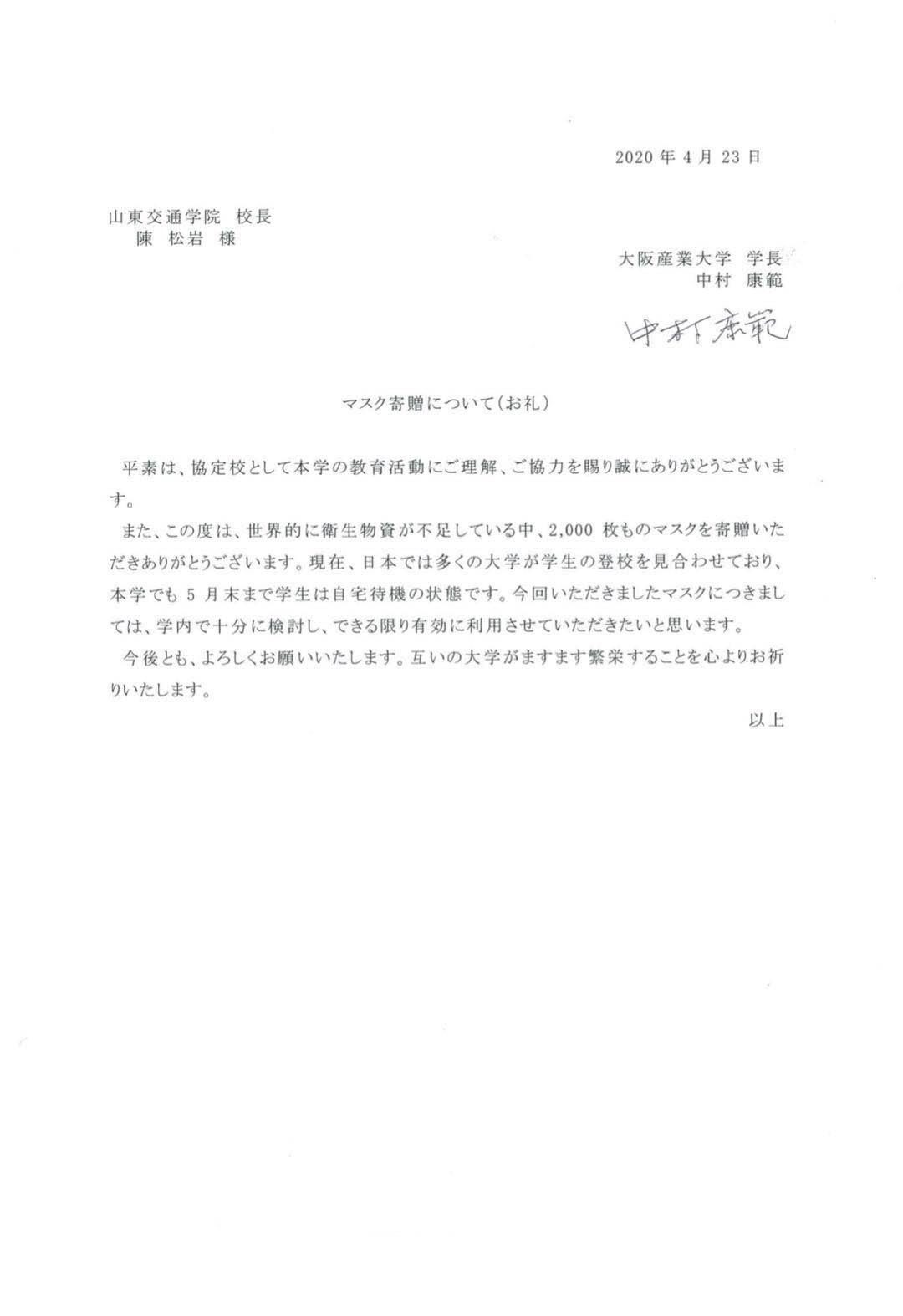 4月23日,日本大阪产业大学、帝京大学发感谢信致谢我校捐助抗疫物资。