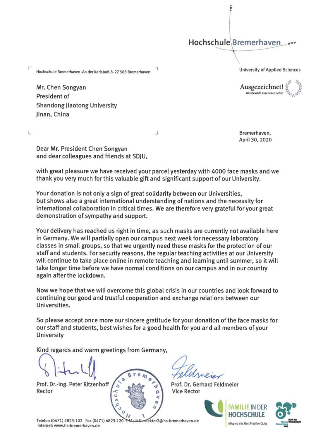 4月30日,德国不莱梅哈芬应用技术大学校长皮特教授和分管外事副校长格哈德教授致信我校院长陈松岩和全体同仁,对我校在疫情期间捐赠的防疫物资表示衷心感谢。