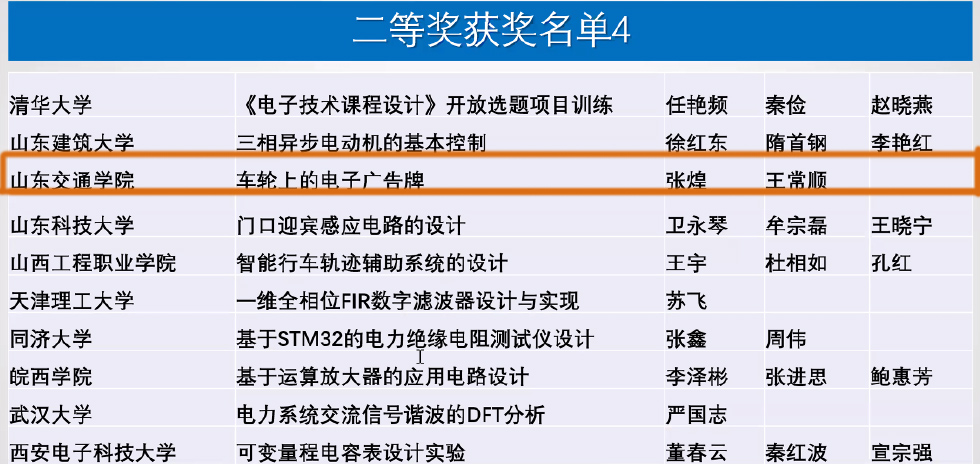 在第七届全国高校电工电子基础课程实验教学案例设计竞赛全国复赛中,我校信息科学与电气工程学院(人工智能学院)教师张煌和王常顺的作品《车轮上的电子广告牌》获得国家二等奖。我校另有五项作品在初赛中分别获得华东赛区二等奖和三等奖。