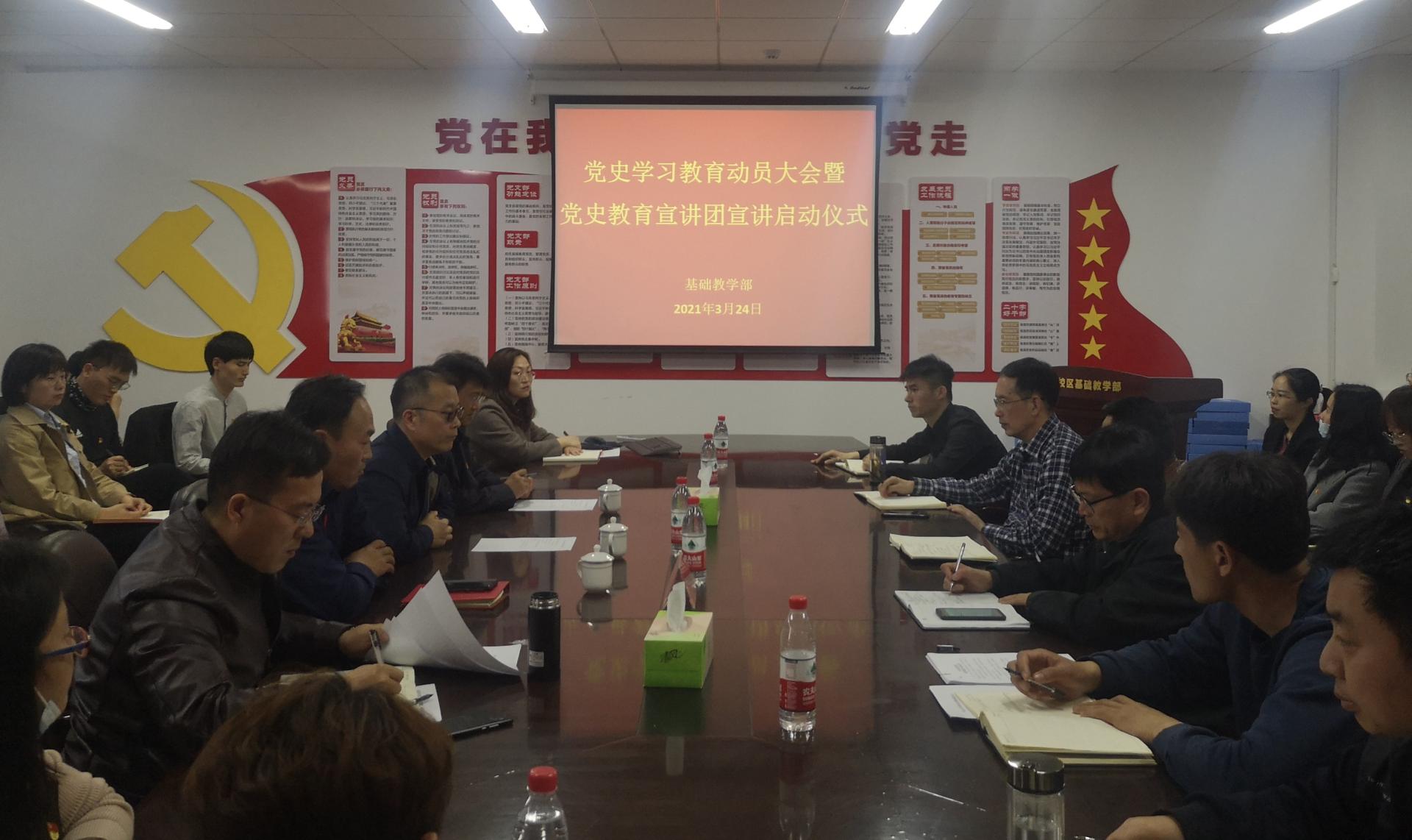 3月24日下午,基础教学部党总支举行党史学习教育动员大会暨党史教育宣讲团宣讲启动仪式。学校党委副书记李贞涛,党委委员、党委组织部部长田杰昌,威海校区管委会相关负责人出席会议。会议由基础教学部党总支副书记主持。