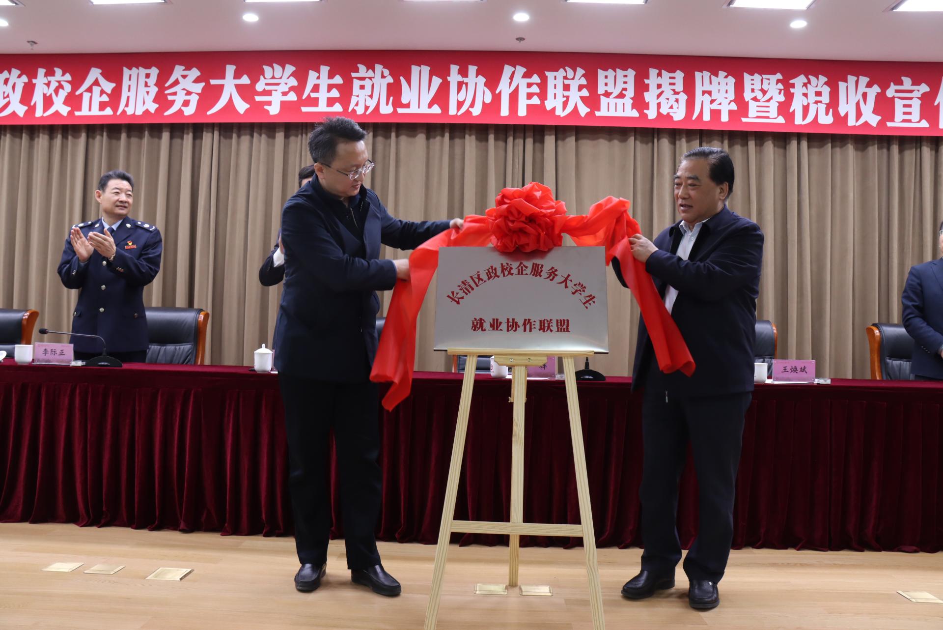 会上,王焕斌、肖辉共同为“长清区政校企服务大学生就业协作联盟”揭牌,宣布“长清区政校企服务大学生就业协作联盟”揭牌暨税收宣传月正式启动。