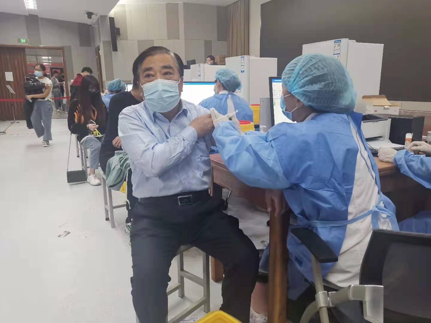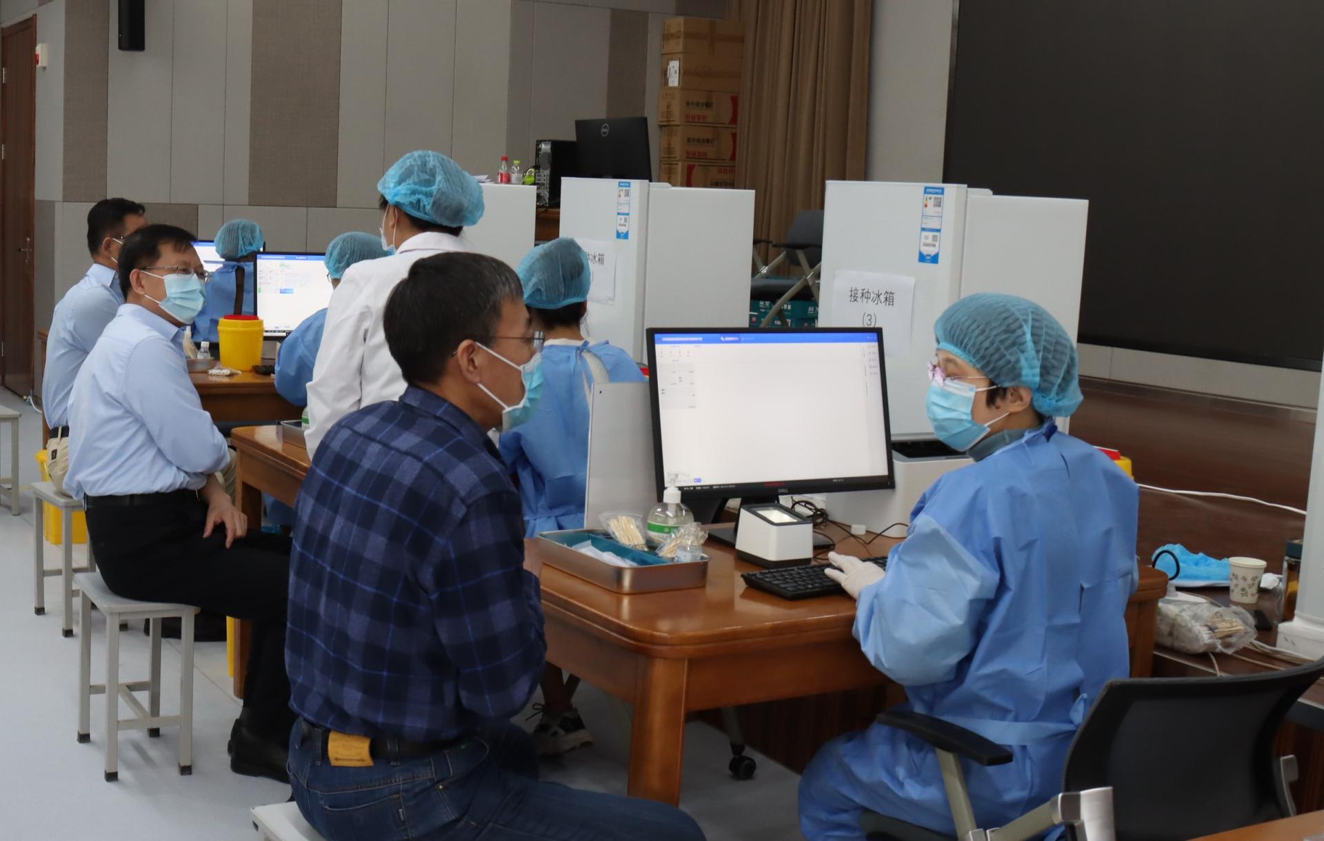 王焕斌到达接种点后,带头接种了疫苗,同时详细询问了接种工作的流程,听取了接种工作开展情况的汇报,强调各单位要加大宣传动员力度,按照“知情、同意、自愿”的原则,加快推进疫苗接种工作,尽早形成校园免疫屏障,保障师生身体健康、生命安全和学校正常教育教学秩序。陈松岩认真查看了接种现场,看望慰问了正在进行接种的工作人员和师生,要求接种人员要严格依照工作规范,切实保障师生身体健康,早日完成全校疫苗接种工作。