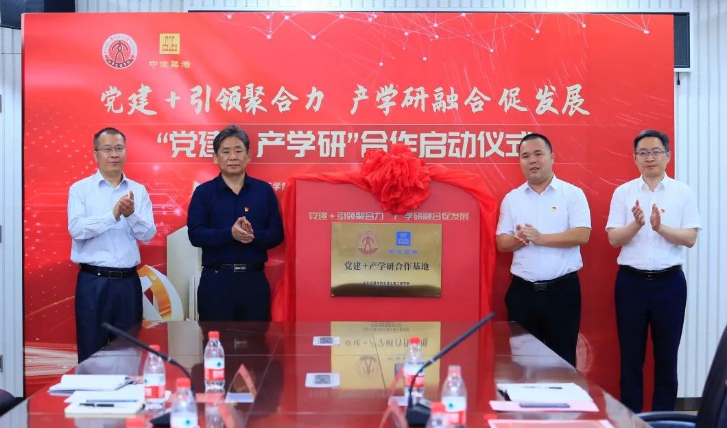 李贞涛对企业多年来对学校改革发展给予的大力支持表示感谢,介绍了学校的发展历史、师资队伍、专业建设、人才培养、学校“十四五”发展规划等方面情况。他指出,要以本次合作为契机,不断挖掘整合校企资源,探索“党建+产学研”融合发展的新模式,助力学校高水平应用型交通大学建设。于建勇从党建筑港、品质筑港、科技筑港、海外筑港、人才筑港五个方面详细介绍了中建筑港集团有限公司基本情况,希望校企双方结合党史学习教育,不断发挥各自优势,深化产学研合作融合发展,实现互利共赢。校企双方就党建工作,项目、成果联合申报,“订单式”人才培养体系建设等方面进行了交流探讨,共同签署“党建+产学研”合作框架协议,并为“山东交通学院交通土建工程学院实习实践基地”“党建+产学研合作基地”揭牌。