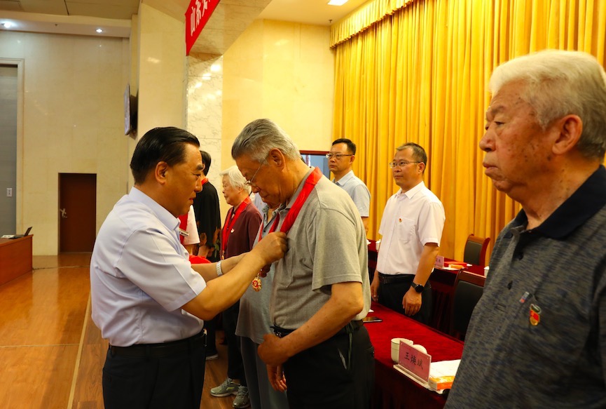 党委书记王焕斌向“光荣在党50年”党员代表颁发纪念章,并由新发展学生党员献花。