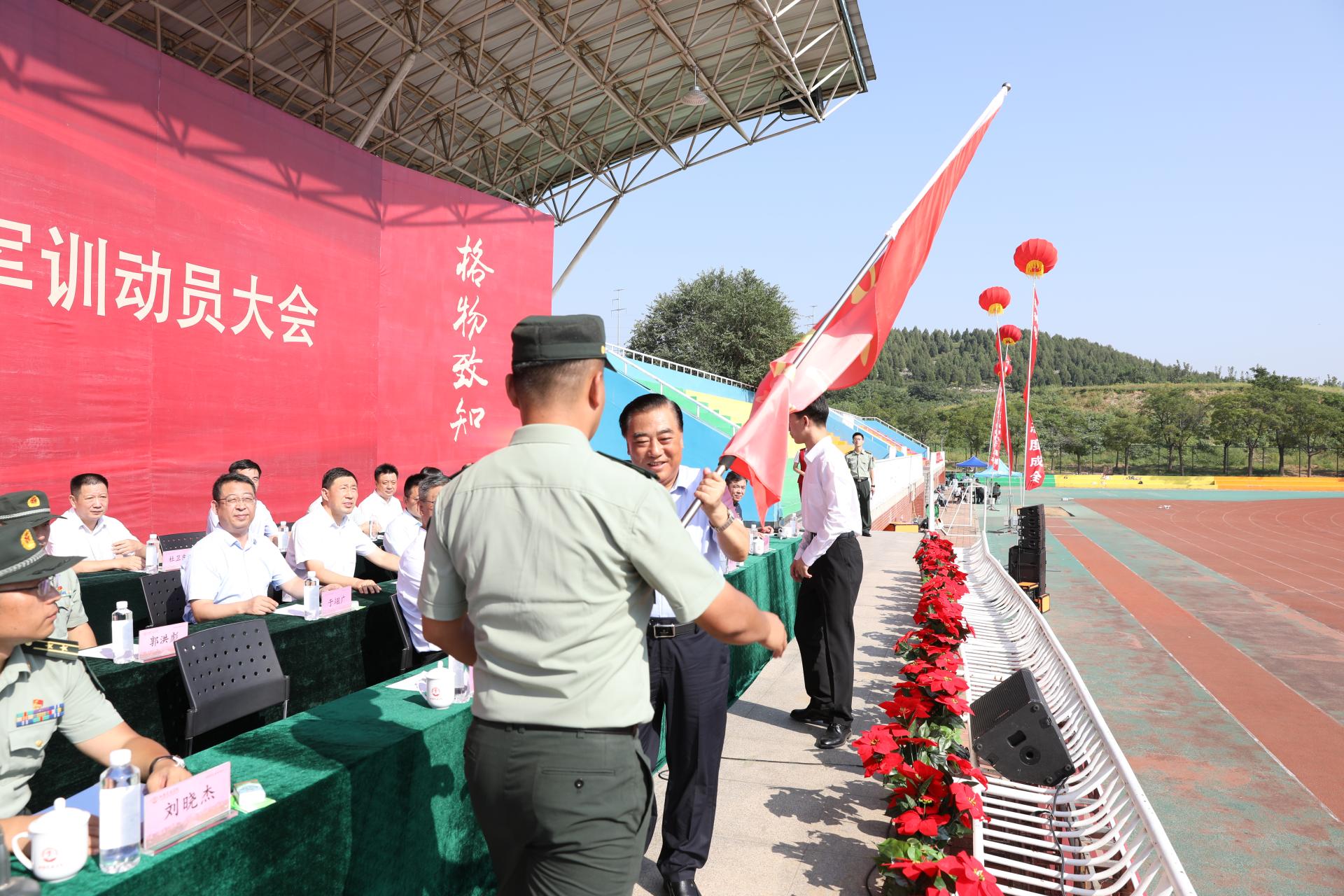 党委书记王焕斌代表学校向2021级新生军训团授旗,表达了全校师生对承训部队官兵的感谢。
