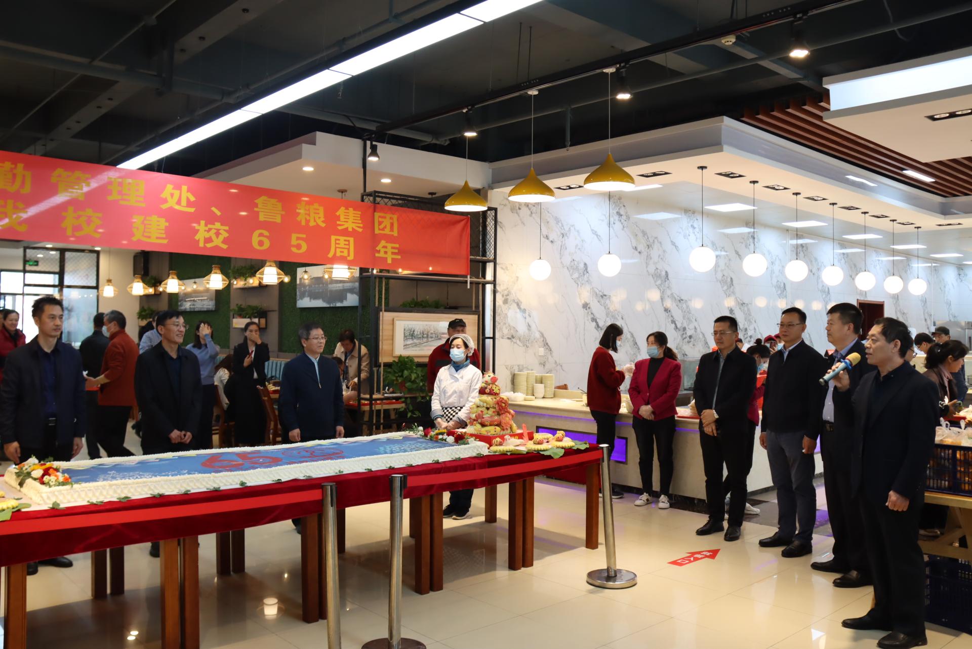 在学校建校65周年校庆日之际,齐鲁粮油公司专门制作了长3米、宽1米的特大节日蛋糕和具有浓郁山东特色的花饽饽,以表达对学校校庆的祝贺。花饽饽精选优质食材,以向日葵、牡丹花、凤凰、石榴、福袋等元素,以精美制作工艺表达了“师恩如山、凤翔九天,牛年如意、虎年可期”的设计立意,祝愿学校“葵花向阳、前程似锦”。