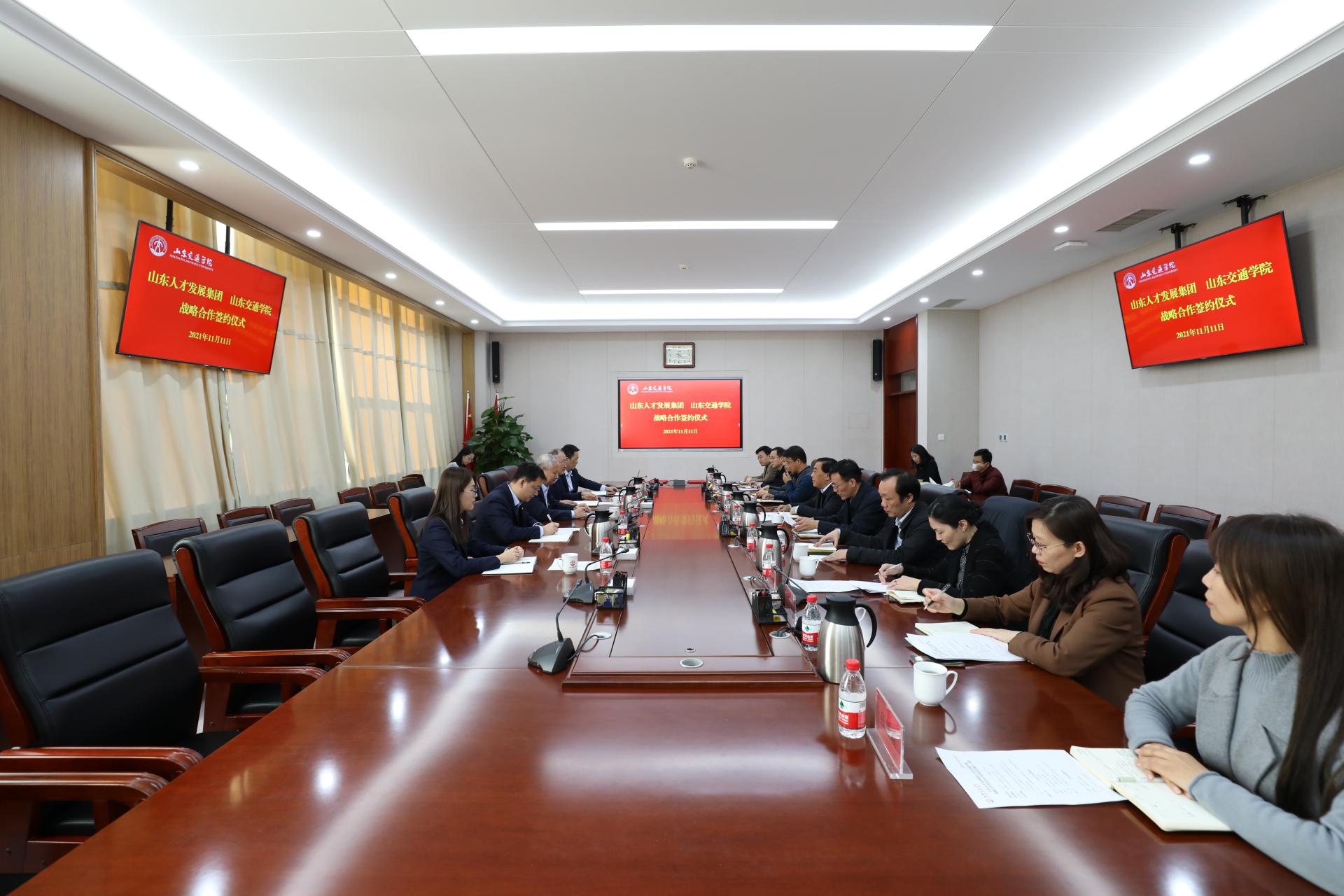 为全面落实“人才强校”战略,加快学校高层次人才体系建设,11月11日,我校与山东人才发展集团在长清校区明德楼303会议室举行合作框架协议签约仪式。山东人才发展集团党委副书记、总经理张祝秀,党委委员、副总经理褚国良;学校党委书记王焕斌,党委委员、副院长来逢波,党委委员、党委组织部部长田杰昌共同出席签约仪式。签约仪式由来逢波主持。