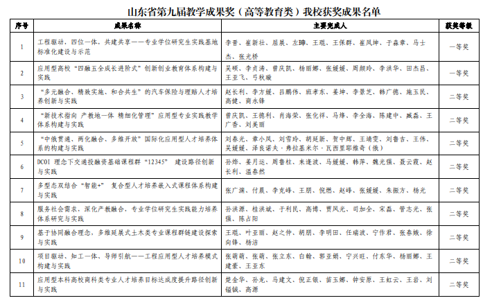 据悉,山东省高等教育教学成果奖每四年评选一次,旨在奖励在教学改革研究和实践中取得优秀教学成果的集体和个人,代表了全省高等教育教学成果的最高水平。山东省第九届教学成果奖共评出奖项607项,其中特等奖32项,一等奖201 项,二等奖374项。