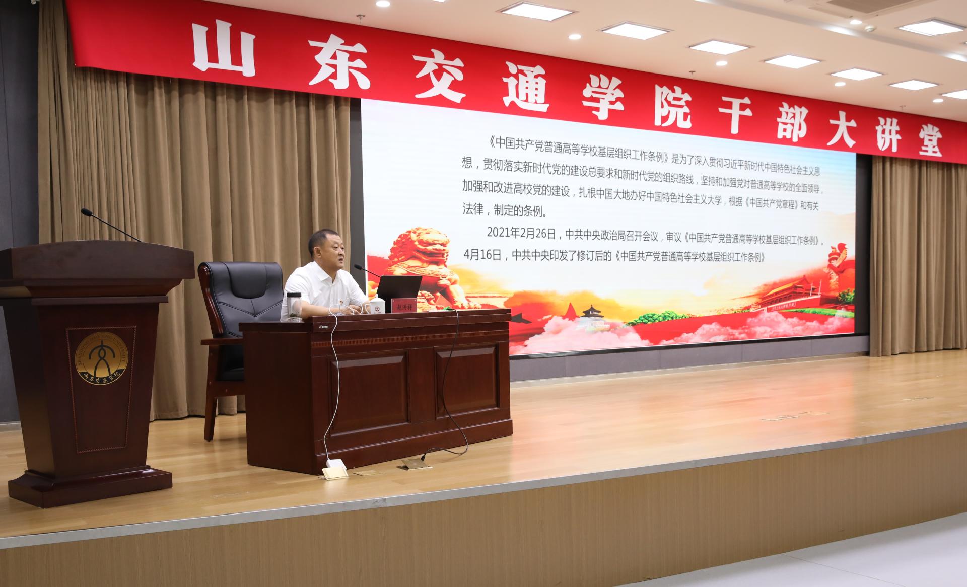 为进一步加强学校基层党组织建设,不断提升党员干部的政治能力和工作本领,6月24日上午,学校在长清校区明德楼101报告厅举办“干部大讲堂”第三讲暨党委理论学习中心组(扩大)集体学习。山东省委党校(行政学院)党建教研部教授、世界政党比较研究室主任、山东省领导科学学会副秘书长、硕士研究生导师赵洪祥作《中国共产党普通高等学校基层组织工作条例》专题辅导报告。学校党委领导班子成员参加会议。会议由学校党委副书记李贞涛主持。