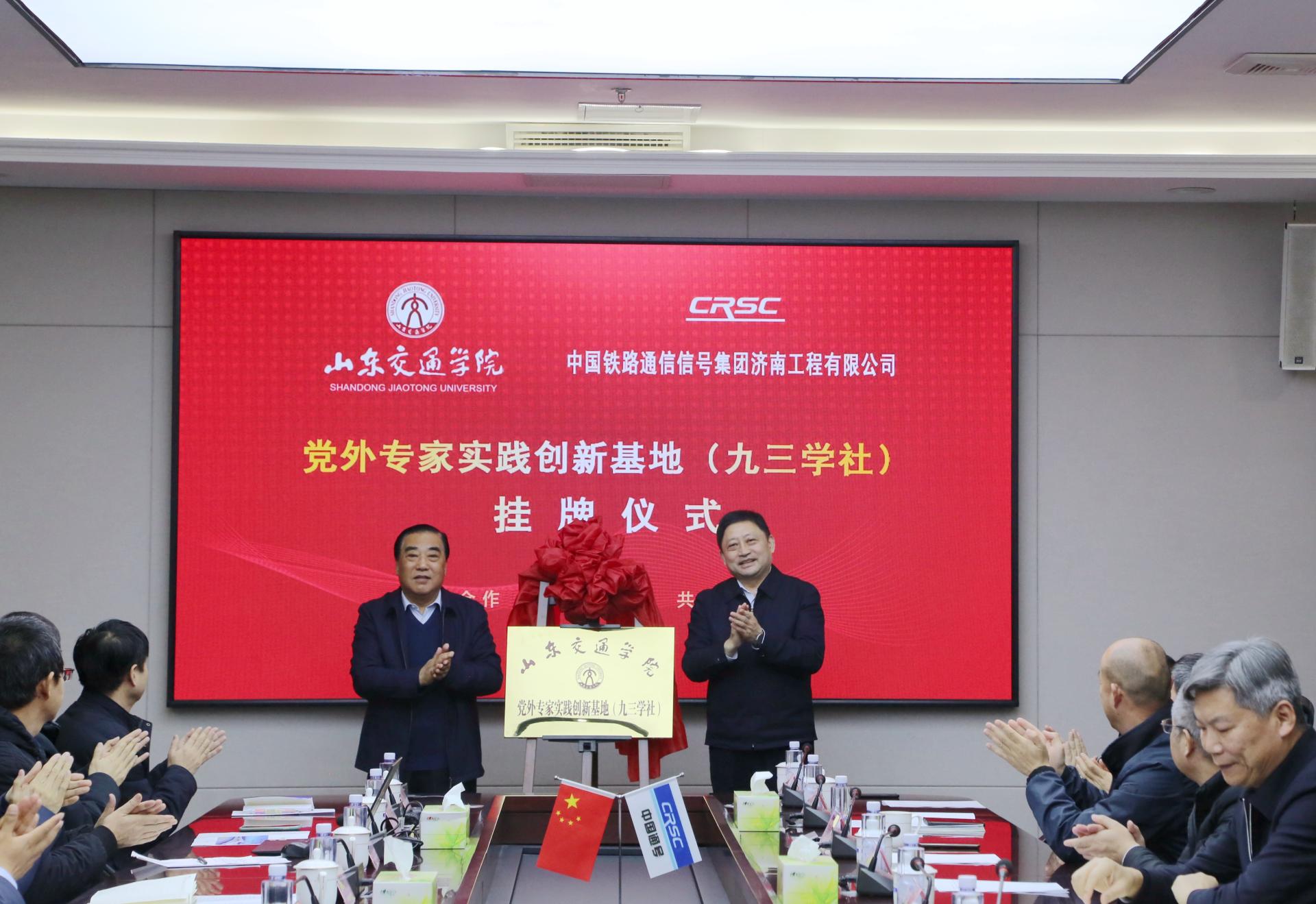 1月8日,学校党外专家实践创新基地(九三学社)揭牌仪式在中国铁路通信信号集团济南工程有限公司会议室举行。学校党委书记王焕斌、中国铁路通信信号集团济南工程有限公司党委书记谢德胜出席活动。
