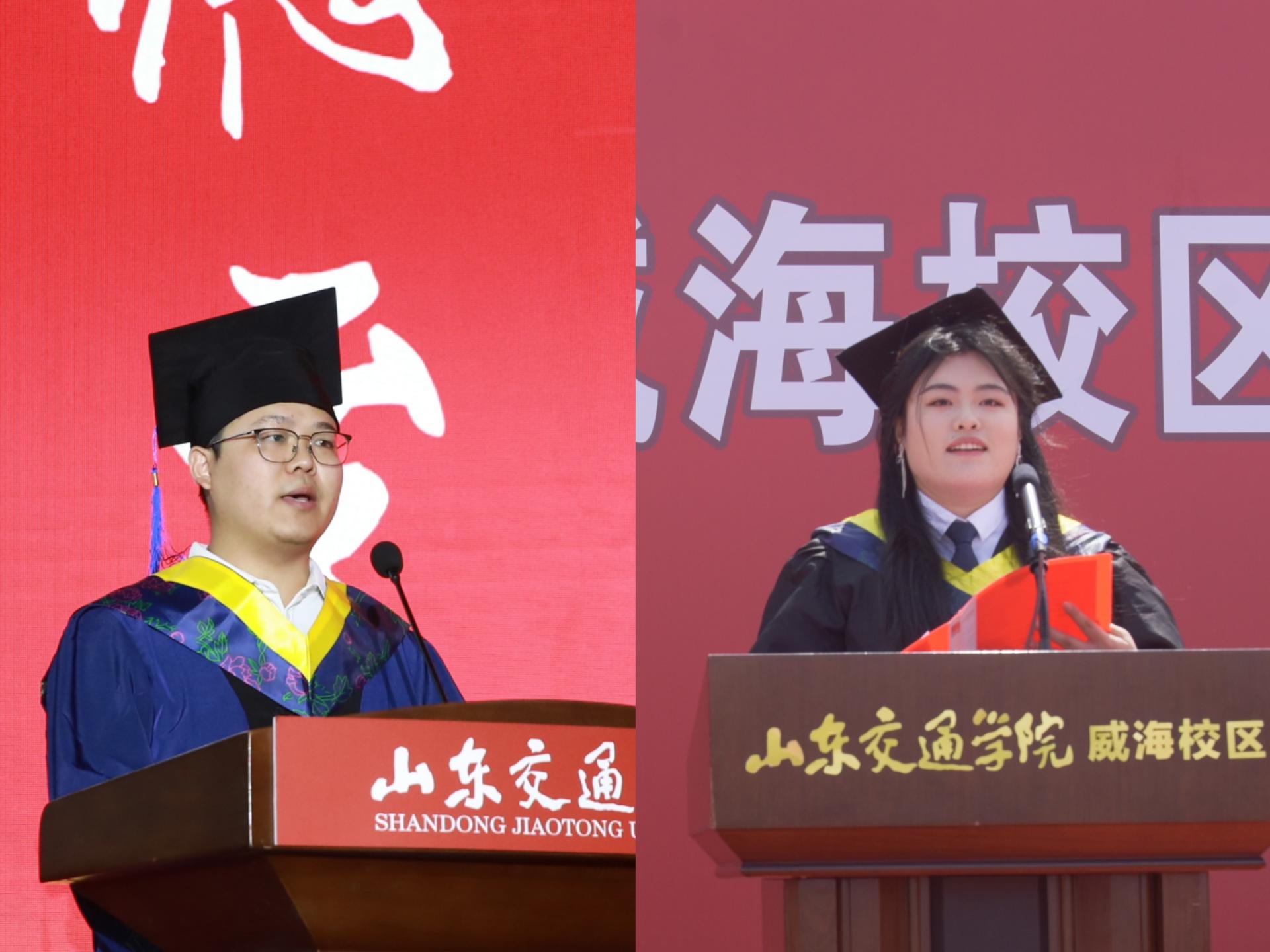 毕业生代表交通与物流工程学院研交通物流211班李开雷、航运学院航海技术201班王荣鑫向母校表达了诚挚感谢,表示将牢记“明德至善 格物致知”的校训,立志做有理想、敢担当、能吃苦、肯奋斗的新时代好青年,为实现中华民族伟大复兴,贡献出智慧和力量,为母校、为国家书写属于自己的壮丽篇章。