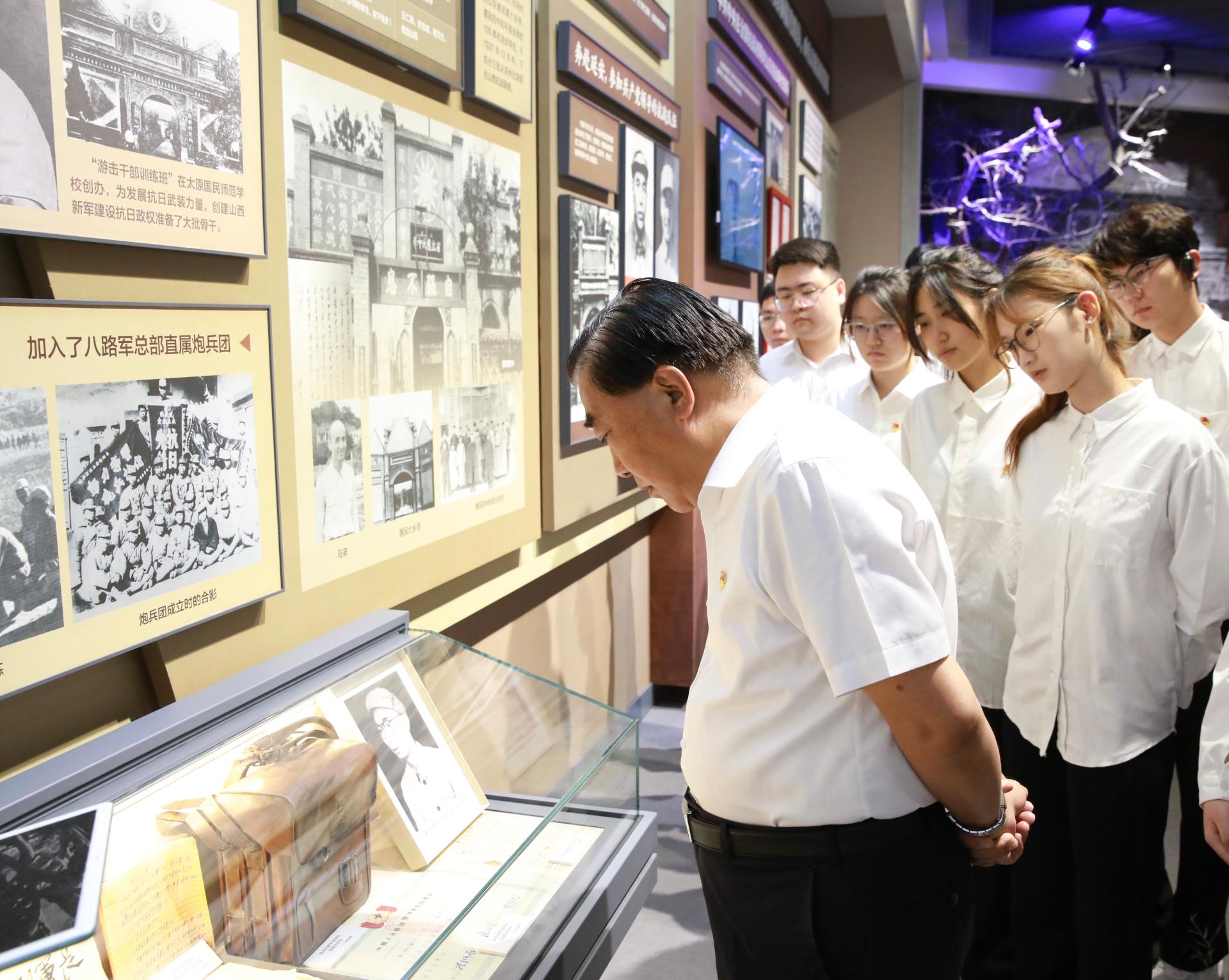 王焕斌与青年学生先后参观了山东老战士纪念广场纪念馆的七个展区,并通过艺术雕塑、情景再现、场景还原等多种形式,深入了解了从抗日战争、解放战争、抗美援朝战争到新中国成立初期,山东军民在党的领导下拥军、参战的历史过程和老战士们的英雄事迹。大家边参观边讨论边分享,在展馆内沉浸式感受这些红色历史、红色人物、红色故事。