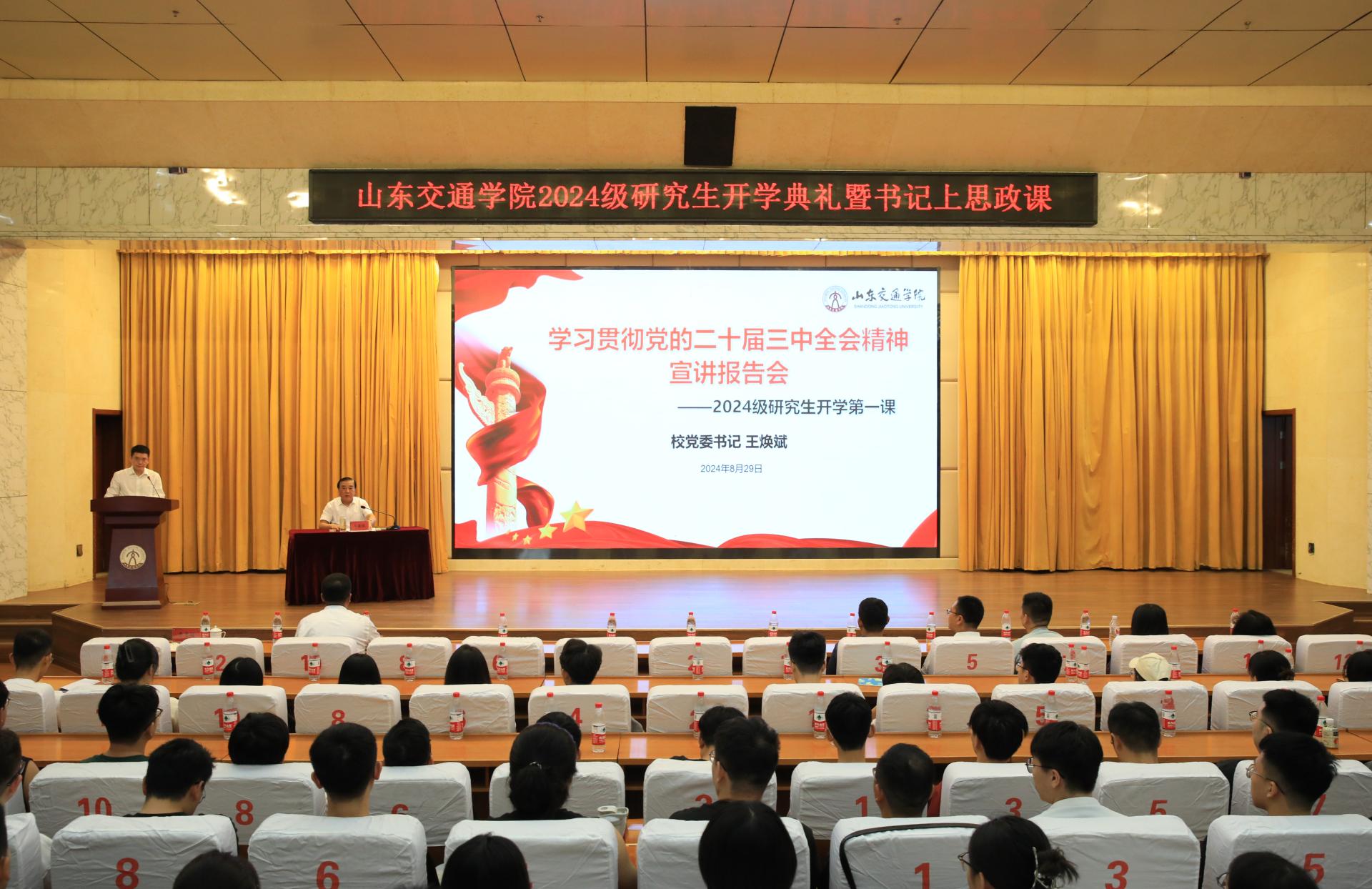 8月29日上午,学校在长清校区学术报告厅举行学习贯彻党的二十届三中全会精神宣讲报告会。党委书记王焕斌为2024级研究生进行党的二十届三中全会精神宣讲,并讲授开学第一课。学校党委委员、副院长李秀领主持活动。