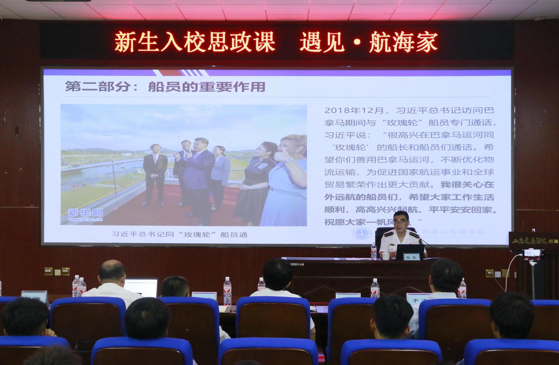 9月25日下午,山东海事局党组成员、副局长张亮,在威海海事局党委委员、副局长黄斌的陪同下,到威海校区为航海类专业2024级新生讲授“新生入校思政课”。学校党委委员、副院长曲同军会见客人并主持授课活动。
