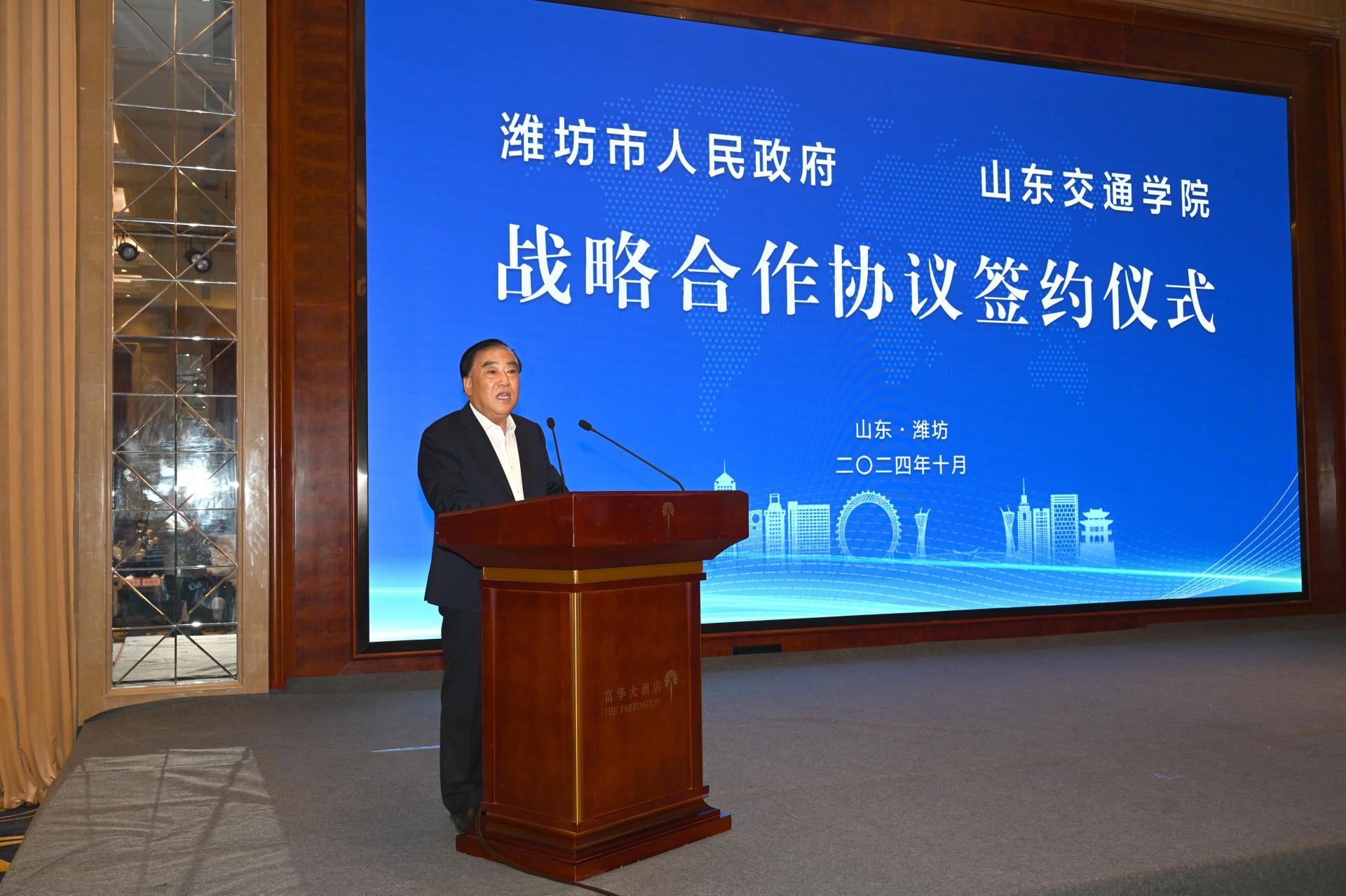 刘运在致辞中表示,山东交通学院建校以来始终秉承“明德至善 格物致知”的校训,全面落实立德树人根本任务,立足山东、服务交通,取得了一系列交通领域重大科研成果,培养了一大批德才兼备、专业精湛的高素质交通人才,为交通强省建设和山东高质量发展作出了重要贡献。本次签约是双方加深交流合作、实现共赢发展的务实之举,必将有力构建政产学研融合发展新格局。希望双方以此为契机,拓宽合作领域、完善合作机制、优化合作环境,彼此赋能推动高质量发展。恳请山东交通学院一如既往地关心支持潍坊,鼓励更多学子来潍创新创业,促进更多成果在潍落地转化,携手打造校地合作新典范。