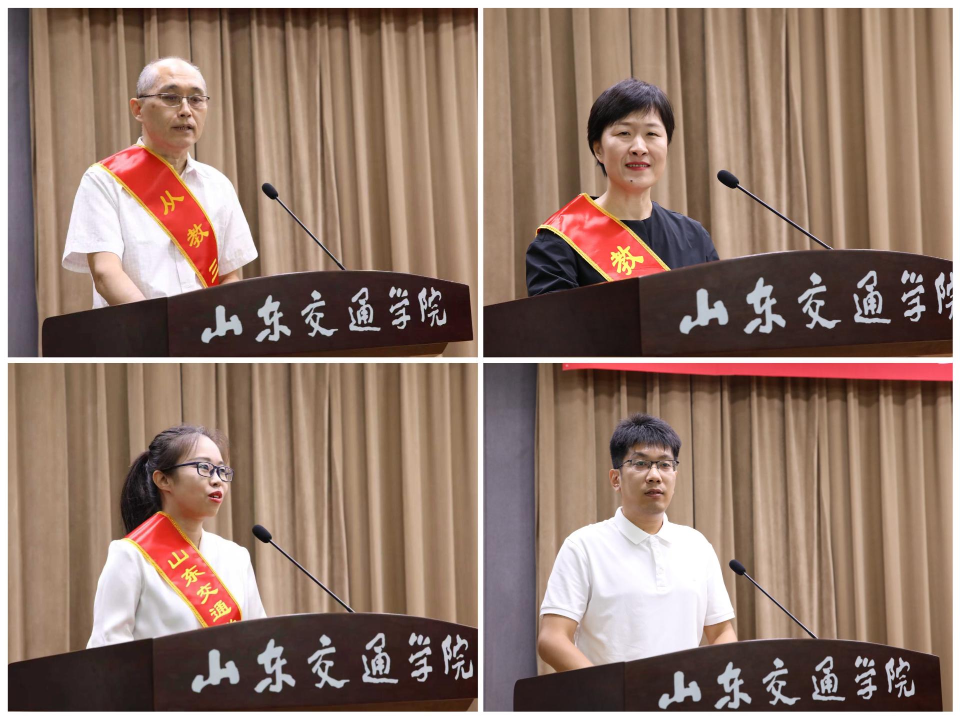 四位教师代表依次发言。光荣执教30年教师代表、艺术与设计学院伊卫东老师回顾了与学校共成长的历程,表达了对教育事业的热爱与坚守;教书育人楷模代表、经济与管理学院李彩红老师分享了以学生为本、推动教学改革、促进产学研融合的实践与思考;师德标兵和优秀教师代表、基础教学部于妲老师结合思政育人经历,阐述了“经师”与“人师”相统一的育人理念;青年教师代表、信息科学与电气工程学院(人工智能学院)卢强老师表达了扎根交院、服务教育强国、交通强国战略的决心与信心。