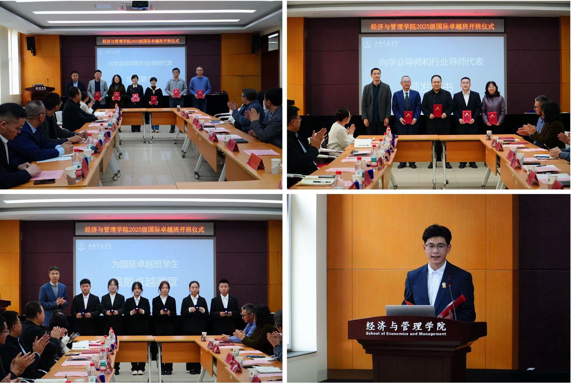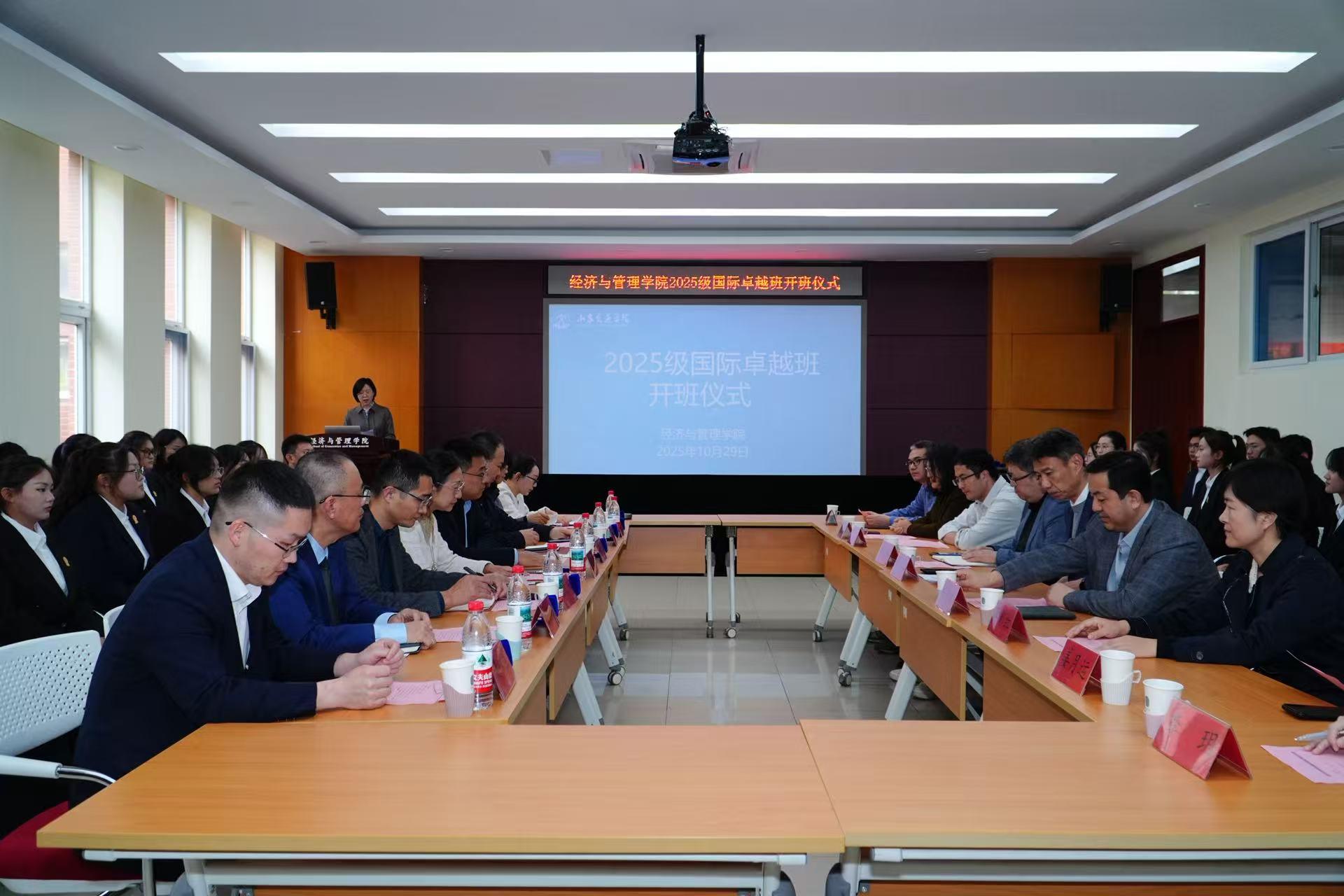 10月29日下午,经济与管理学院在长清校区1B04会议室举办2025级国际卓越班开班仪式。学校党委委员、副院长张萌萌;天津环渤海金融研究院院长刘瑞,信永中和会计师事务所济南分所合伙人孙晓琳、晋菊兰,北京银行济南龙奥支行行长助理黄永生出席。活动由经济与管理学院副院长聂云霞主持。