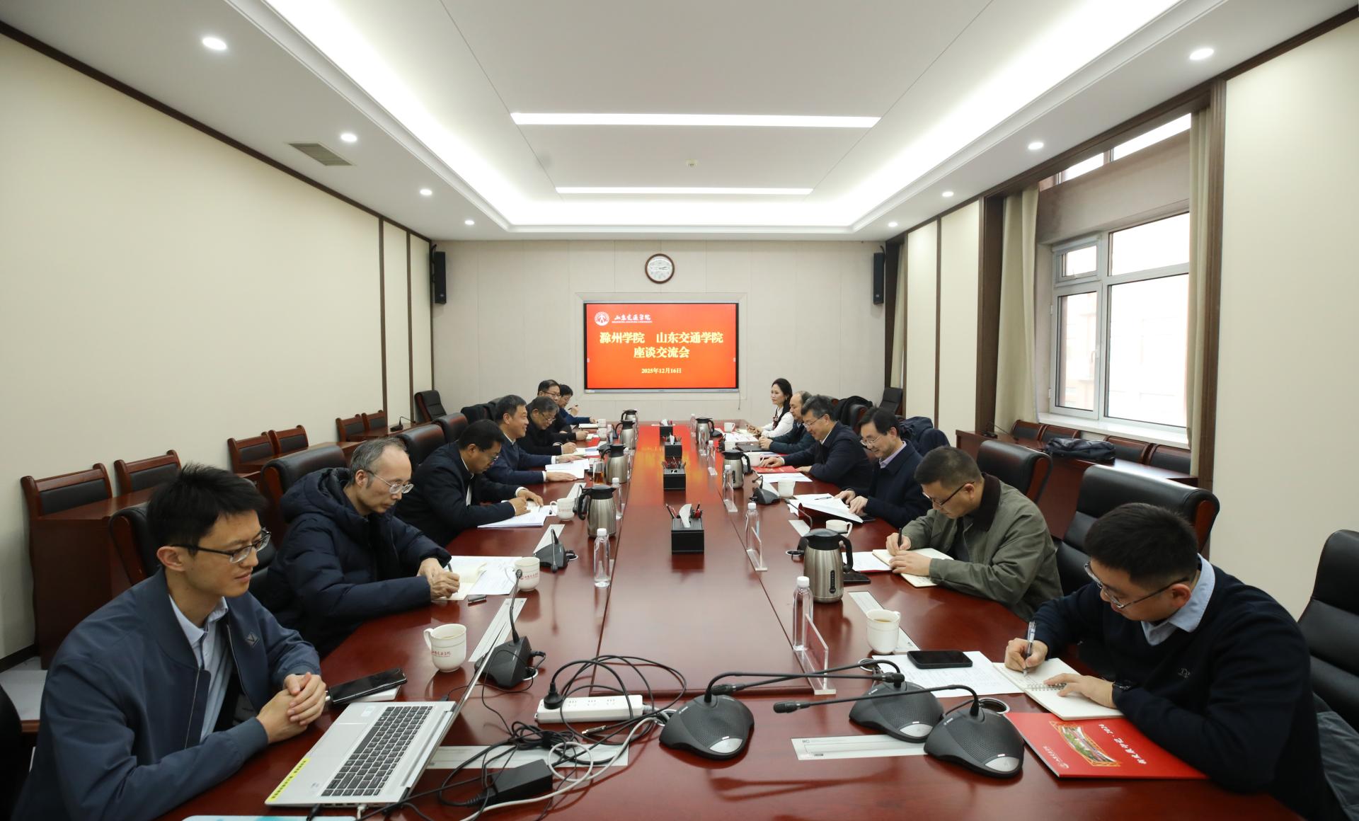 12月16日下午,滁州学院党委书记周旭一行来我校调研交流。座谈会在长清校区明德楼302会议室召开。学校党委书记王伟,党委副书记、院长孔伟金,党委委员、副院长王保群会见来宾。