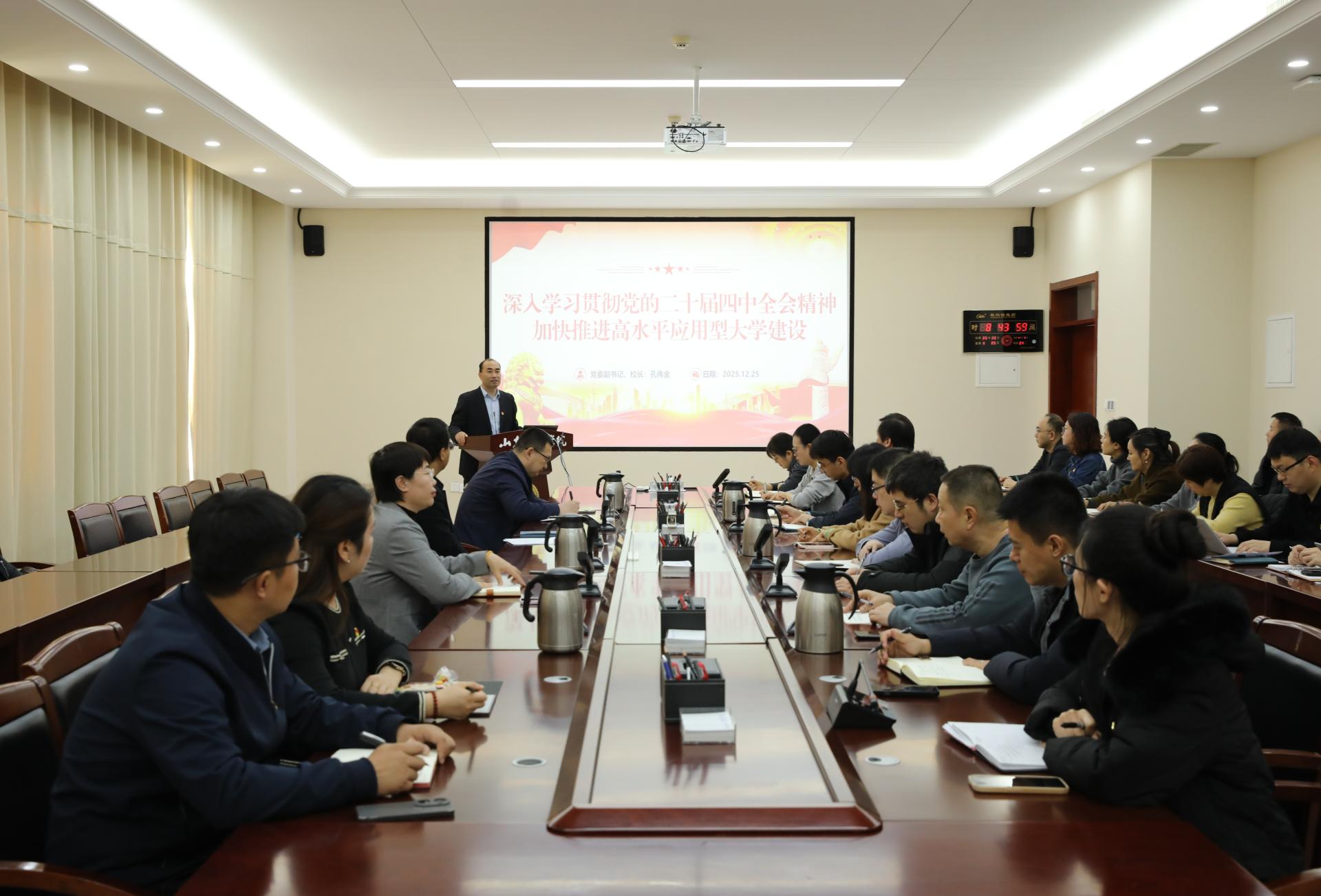 12月25日上午,学校党委副书记、院长孔伟金以“深入学习贯彻党的二十届四中全会精神,加快推进高水平应用型大学建设”为题,在长清校区明德楼301会议室为所在党支部及所联系分管单位(部门)的党员干部代表,讲授党的二十届四中全会精神专题党课。