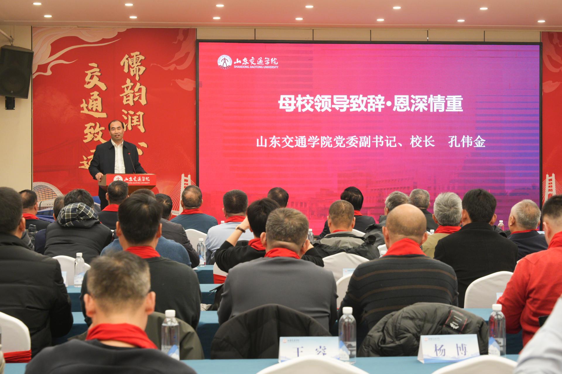 孔伟金代表学校向济宁校友会换届大会暨合作发展推介会的顺利召开表示热烈祝贺,并从“交通立校”“学术兴校”“人才强校”“开放活校”“文化润校”五个方面介绍了学校在人才培养、学科建设、合作发展等方面的发展成绩。他指出,济宁校友会成立30年来,始终是联结母校与校友、服务地方发展的重要平台,凝聚了一大批扎根济宁、奋发有为的优秀校友,成为母校在鲁南地区的亮丽名片。他对济宁校友会提出三点期望:一是厚植文化,凝聚校友之情,让校友会成为济宁交院人的温暖家园;二是交融共进,搭建合作之桥,推动校企协同、产教融合,共建发展共同体;三是同心致远,共筑发展之梦,以建校70周年为契机,共同弘扬交院人精神,助力母校与区域发展。