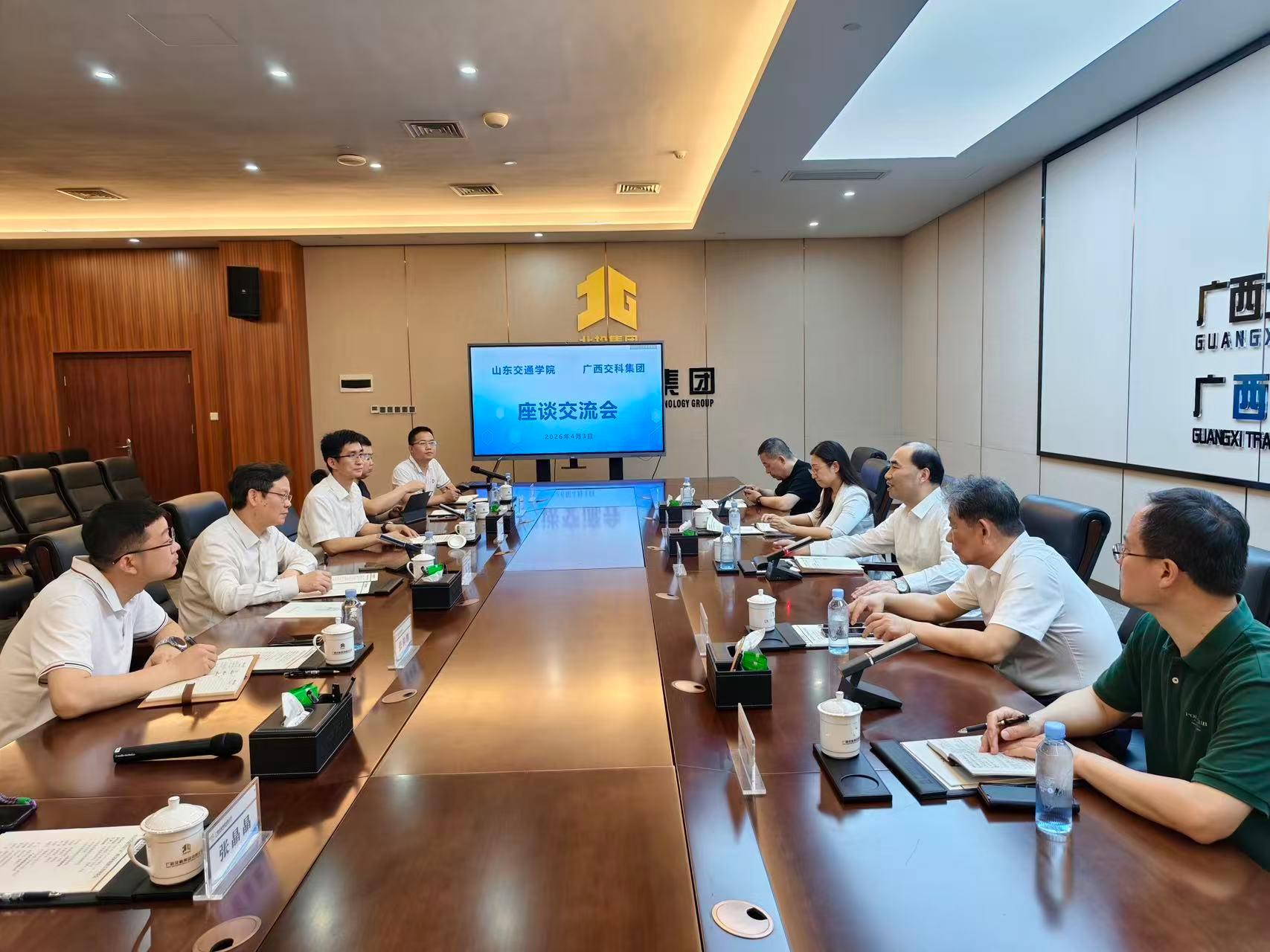 在广西交科集团有限公司,孔伟金一行受到集团党委书记、董事长冯坚等热情接待。座谈会上,孔伟金重点介绍了学校的科研优势和产教融合实践,并表示,学校在交通工程、智能装备、新材料应用等方向形成了一批特色科研团队,拥有多个省部级重点实验室和工程技术中心,近年来承担了大量横向科研项目,具备较强的应用研究和技术服务能力,希望与广西交科集团在联合技术攻关、科研成果奖项申报、研究生联合培养等方面开展多维度对接、体系化合作,真正实现优势互补、互利共赢。冯坚表示,山东交通学院在应用型科研和人才培养方面成果丰硕,与集团业务方向高度互补。期待双方在智慧交通、绿色公路、检测技术等领域开展实质性合作,共同推动交通科技创新和成果落地。双方围绕交通科技领域的联合技术攻关、高层次人才共享以及省部级科研成果奖项联合申报等议题展开深入探讨,并就建立常态化交流机制达成初步共识。