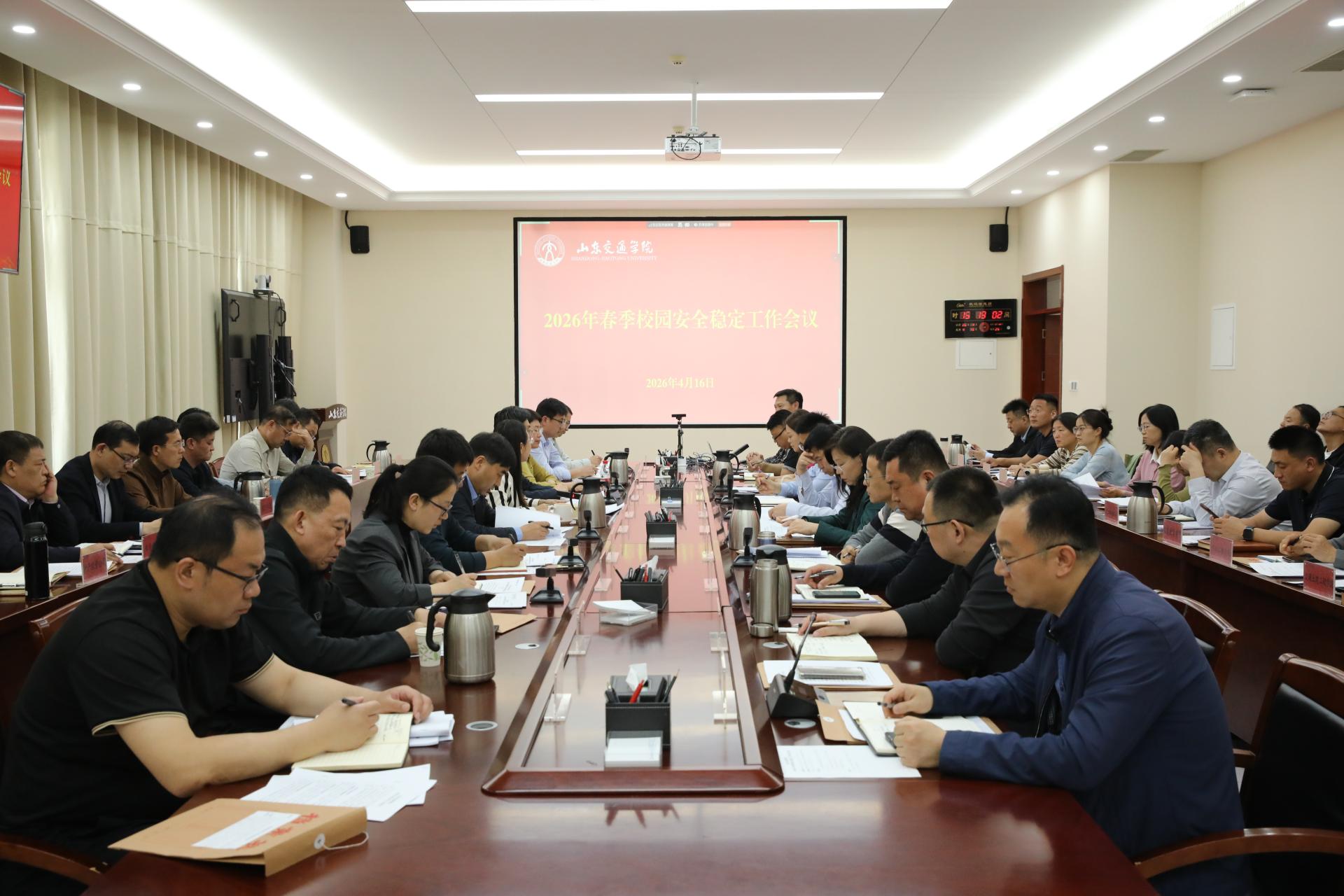 4月16日下午,学校在长清校区明德楼301会议室召开2026年春季校园安全稳定工作会议。学校党委副书记聂法良,党委委员、副院长张萌萌出席会议。